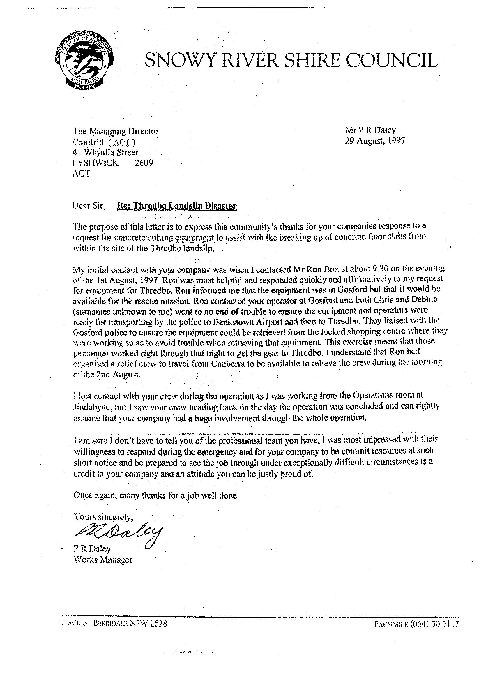 Contribution to Thredbo Disaster Rescue and Relief Operation
